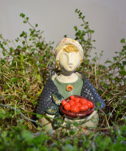Cette dame porte une corbeille de fruits rouges dans ses bras.