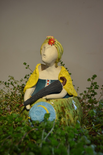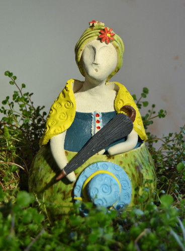 Cet oya se remplit d'eau par le tube sous le corps, l'eau est stockée dans la partie ronde de la sculpture, un petit bouchon en liège est fourni afin de boucher le tube.