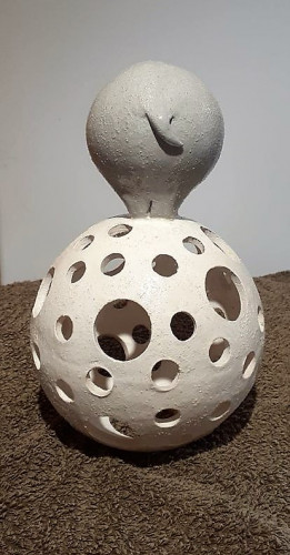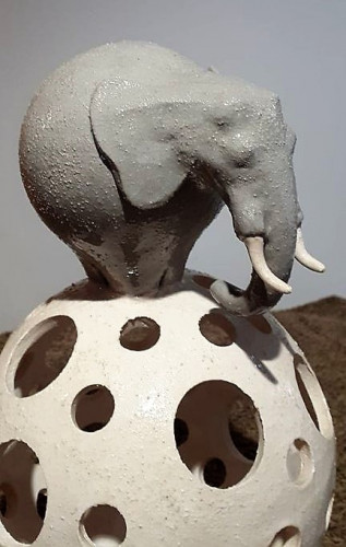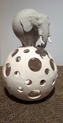 Eléphant en grès gris émaillé transparent brillant, debout sur une boule ajourée en grès blanc émaillé brillant. Livrée avec une guirlande lumineuse (Led) fonctionnant avec piles (piles non fournies)